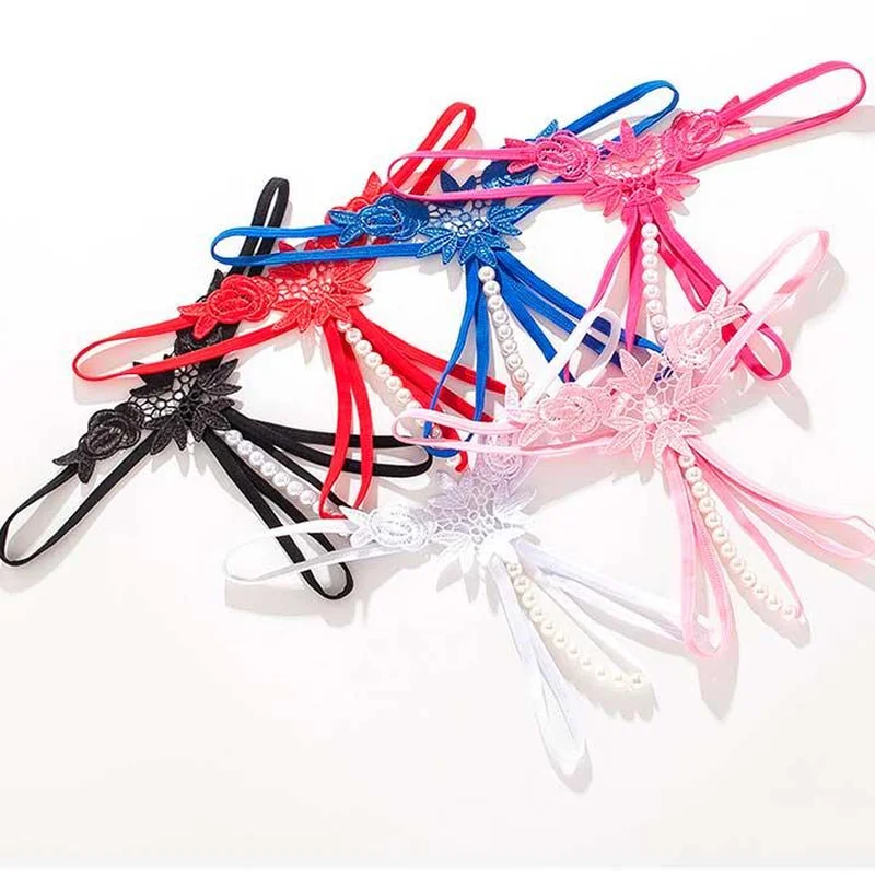 Стрінги з намистинками та квітами - Фуксія - S/M - Еротична білизна