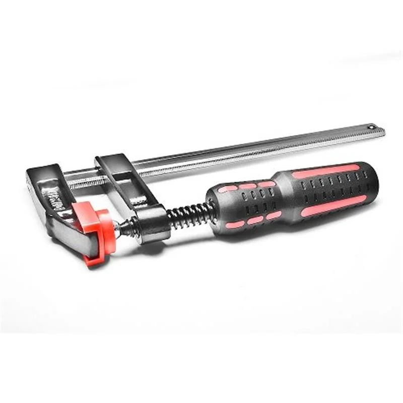 Струбцина F-типу Stark 50x250 мм - ручний інструмент для затиску деталей, предметів, виробів із пластику, дерева, скла, металу та ін. Використовується при будівництві, виробництві, ремонті. Струбцина F-типу виготовлена з нержавіючої нікельованої сталі, що додає міцність і довгий термін служби інструменту. Також струбцина захищена від корозії. М’які губки дбайливо ставляться до поверхні, не дряпаючи і не продавлюючи її в процесі затиску. Діапазон захоплення предмета до 250 мм дозволяє використовувати струбцину в багатьох сферах виробництва і ремонту. Спіральний механізм дає можливість контролювати силу натискання на деталь. Прогумована рукоятка не ковзає в руці в процесі закручування. А також є можливість повернути рукоятку на 90 ° для більш зручного захоплення і для роботи у важкодоступних місцях.