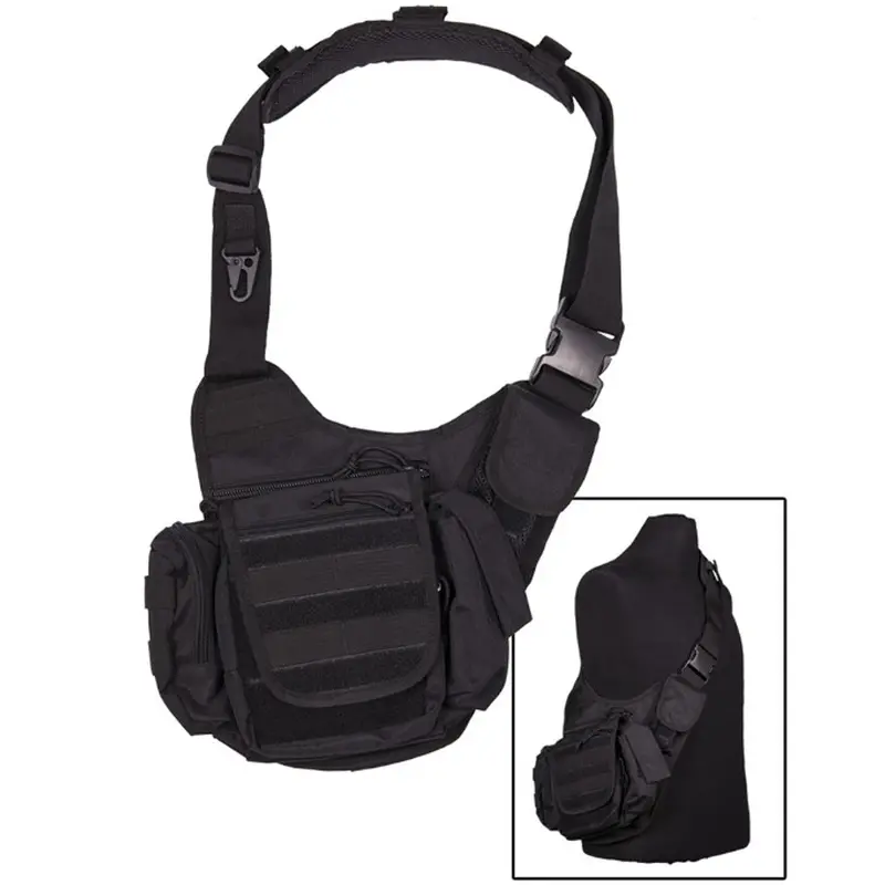 Сумка через плечо из полиэстера черного цвета. Для защиты от влаги изнутри он покрыт слоем ПВХ-материала. Сбоку корпуса находится амортизирующая пена EVA, покрытая прочной дышащей сеткой, повышающей комфорт использования. Плечевой ремень съемный с композитной пряжкой оснащен регулировкой длины, металлической пряжкой HK и поролоновой накладкой с возможностью ее разборки.