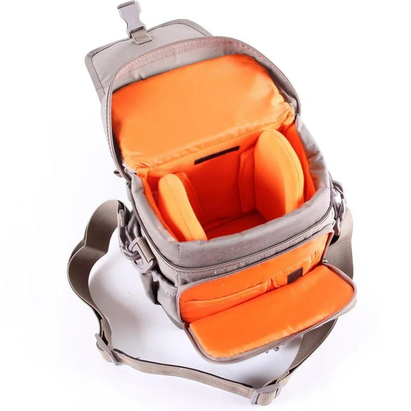 Головне відділення з переміщується (на липучці) закривається на змійку і додатково фіксується карабіном (При частому діставанні фотокамери можна застібати тільки на клямку - а блискавка для тривалих переїздів). Усередині оздоблена м'яка бархатиста тканина, що унеможливлює подряпати вміст. Щільні стінки, чудова фіксація фотокамери із "середнім" об'єктивом. На лицьовій частині велика кишеня на "блискавці", всередині якої є ще 2 кишеньки для дрібніших аксесуарів таких як карти пам'яті, перехідники і т.д. 2 бічні кишеньки на гумовій стяжці. На задній стінці ще одна кишенька (там наприклад можна розмістити мікрофіброву серветку). Зовнішні розміри: 20 x 21 x 13 см Основне відділення: 17 x 19 x 9 см