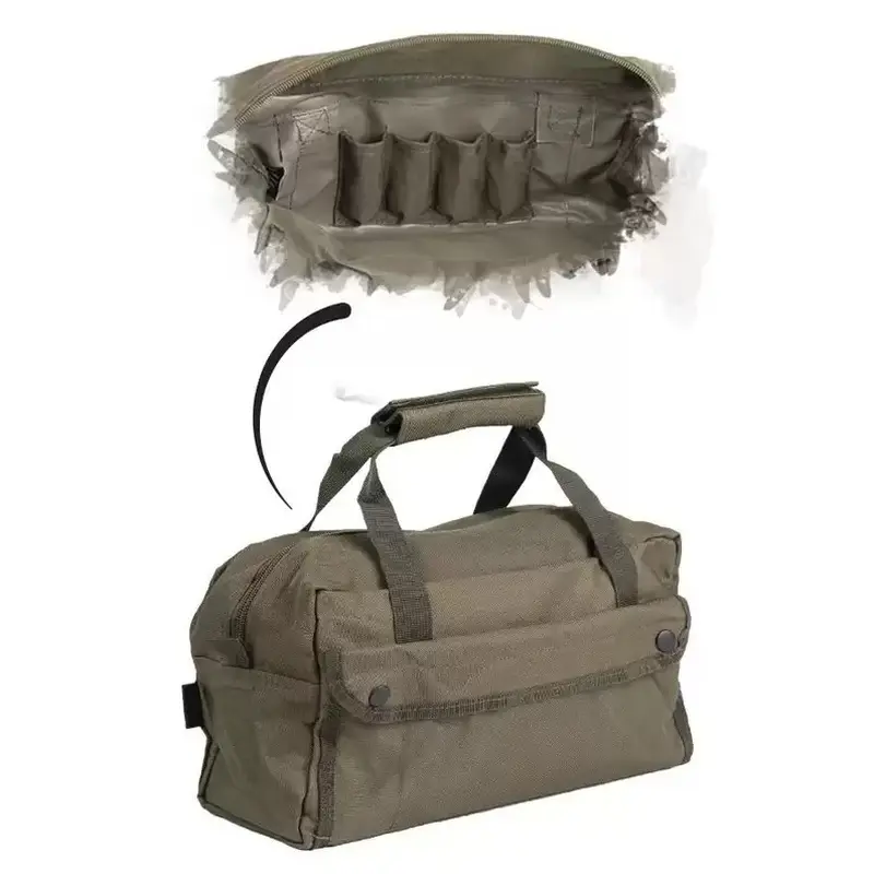 Небольшая сумка для транспортировки предназначена для переноски подручных инструментов. Он изготовлен из хлопка, а ручки для переноски из полипропилена.