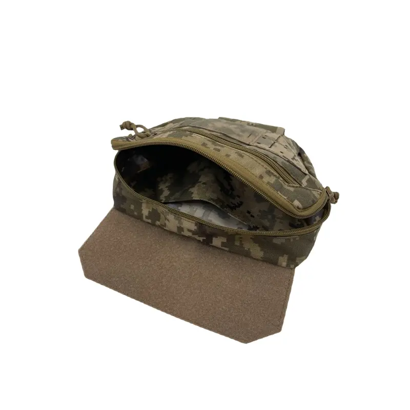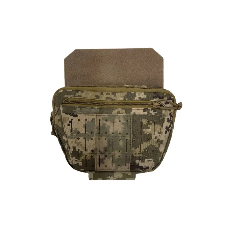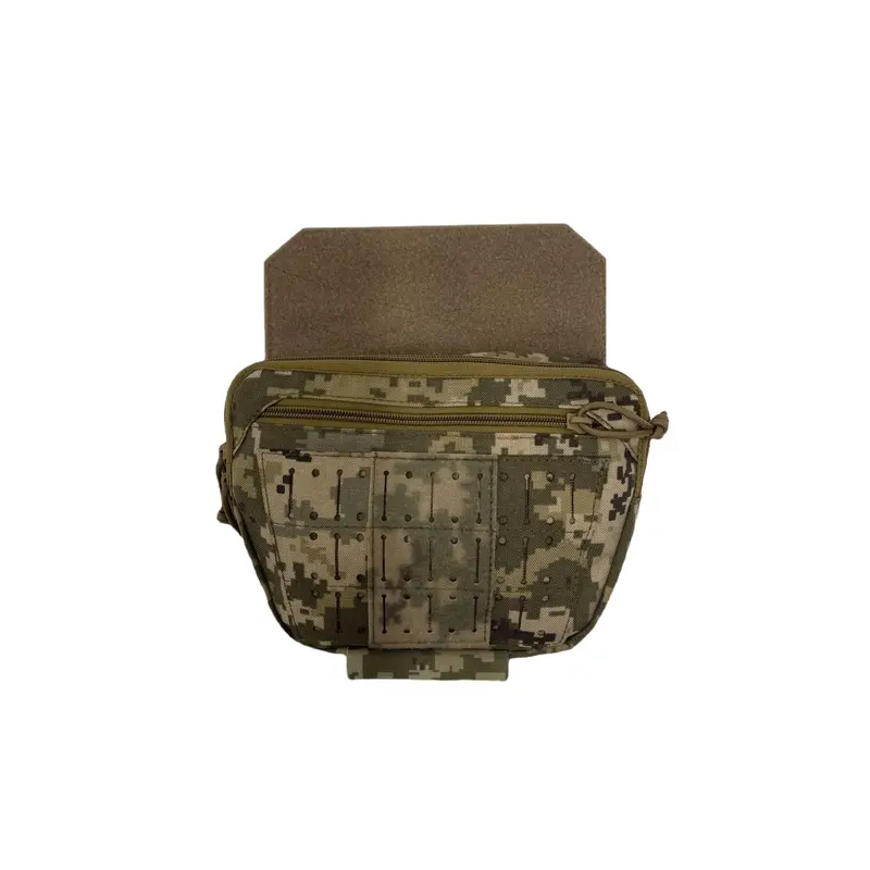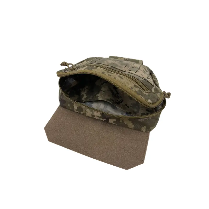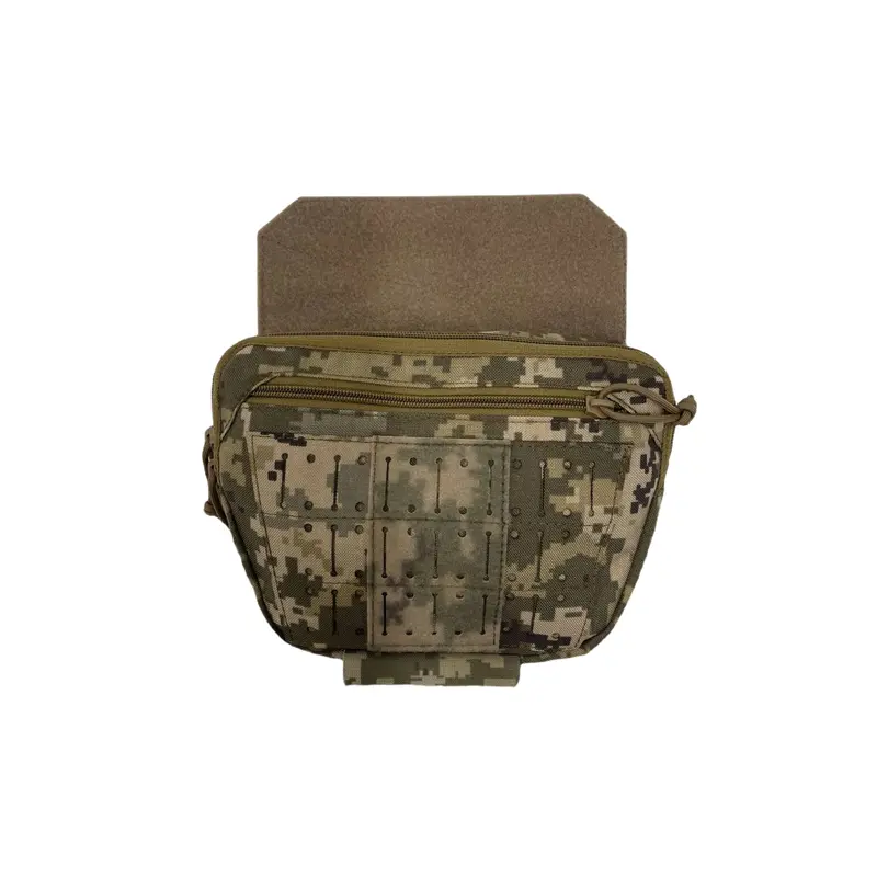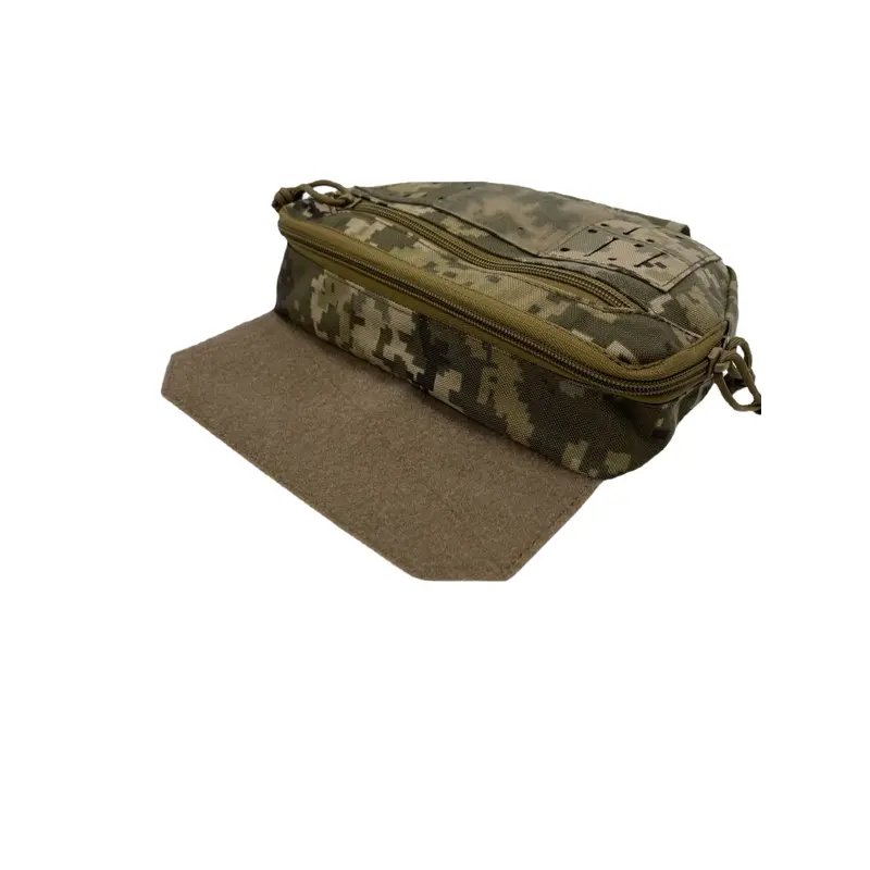 Сумка имеет две большие велкропанели. Фронтальная велкро-панель оснащена интерфейсом MOLLE Laser Cut, позволяющим прикреплять к сумке дополнительное снаряжение, например, итоги или другие аксессуары. Это расширяет функциональность сумки и позволяет персонализировать ее под свои потребности и задачи.