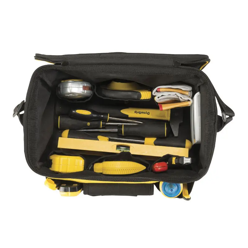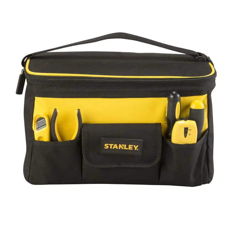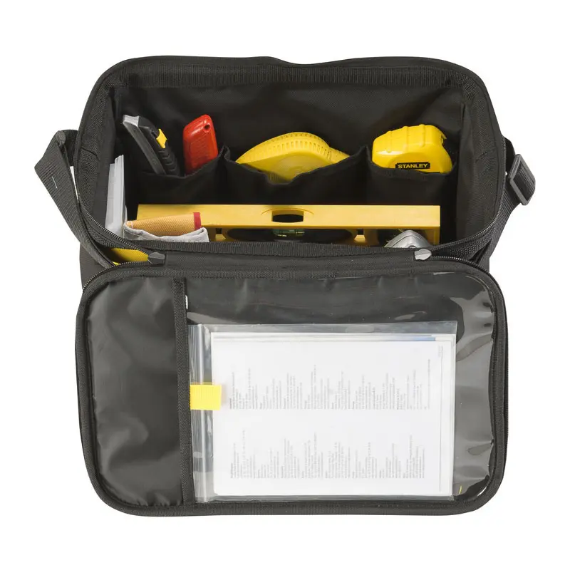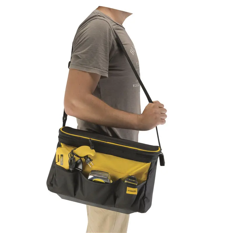 Сумка інструментальна Stanley Deep Covered Bag 14" (37х23х25см) STST1-73615 - Виготовлена з міцної зносостійкої тканини - поліестеру з щільністю плетіння 600 x 600 деньє- У комплекті має наплічний ремінь для зручності перенесення- Застібка-блискавка з великими гумовими язичками замку, що дозволяє відкривати сумку навіть в рукавичках.- Велика кількість кишень забезпечують зручності організації зберігання- Закритий кишеню на лицьовій стороні для зручності зберігання дрібних деталей- Відмінний огляд вмісту сумки у відкритому положенні- Жорстка конструкція забезпечує зручність при наповненні сумки- Поздовжні пластмасові вставки захищають дно сумки від бруду на робочої майданчику- 370 х 230 х 250 мм