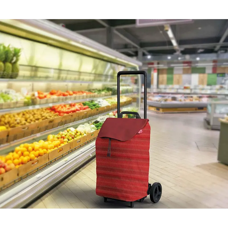 Сумка-візок Gimi Easy Red (168419) - стильна і вмістка сумка для шопінгу. Водостійка тканина сумки, забезпечує захист від попадання вологи, пилу чи бруду всередину. У верхній частині сумки-візка по периметру розташована стяжка і накрита клапаном для забезпечення захисту від вологи під час опадів. Колеса діаметром 15 см дозволяють легко переміщати візок торговими центрами, ринками та міськими тротуарами. Сумка легко знімається з каркасу шасі за допомогою системи Easy-Click. Платформа легко складається до наступного використання або транспортування в автомобілі.