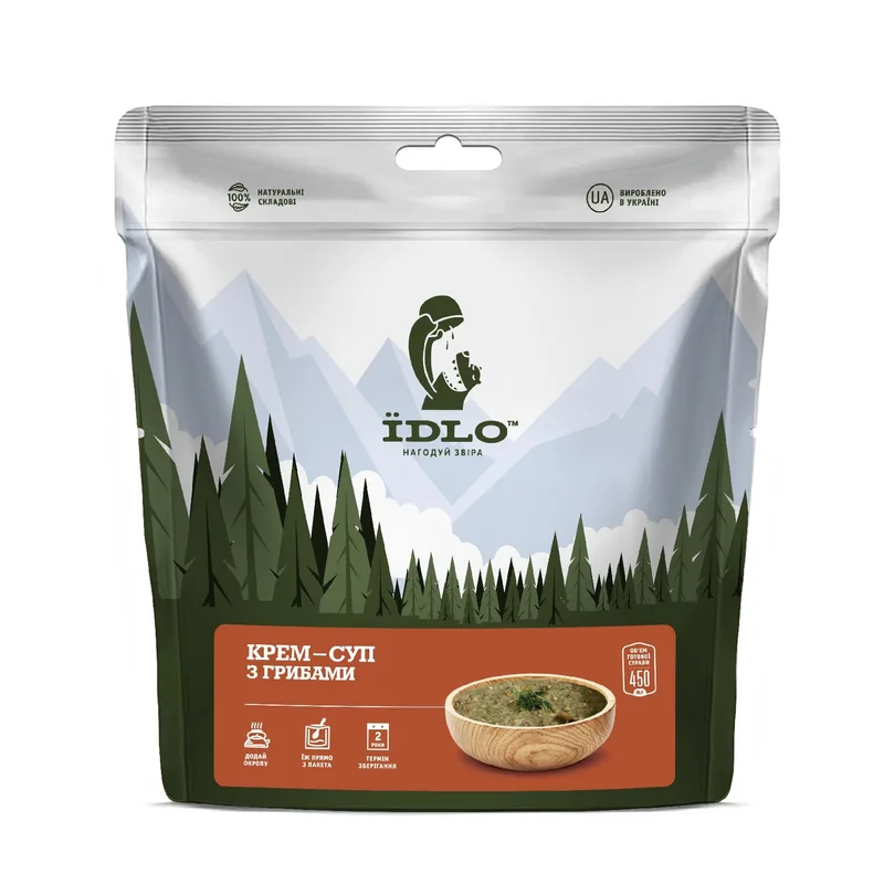 Состав: картопляні пластівці, шампіньйони сушені, цибуля сушена, петрушка сушена, кріп сушений, вершки сушені, перець, сіль