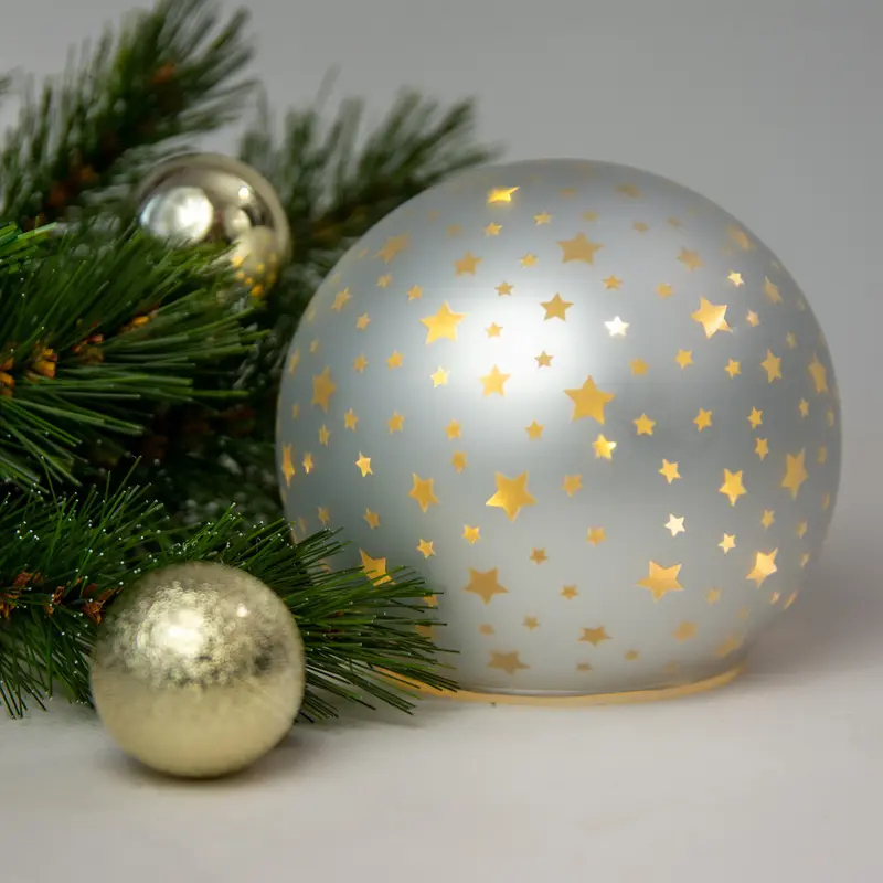 Декоративний світильник Chomik у формі кулі — це вишуканий елемент святкового або повсякденного інтер’єру, який наповнює простір м’яким світлом і атмосферою затишку. Виготовлений зі скла, цей білий світильник має елегантний візерунок на поверхні та вбудовану LED-підсвітку, що створює ефект зоряного неба. Завдяки компактному розміру 12×11 см він легко розміщується на полицях, столах чи підвіконнях, додаючи інтер’єру чарівного сяйва.Особливості Вбудоване LED-світло забезпечує м’яке, енергозберігаюче освітлення з приємним візуальним ефектом. Скляна поверхня з декоративним візерунком виглядає ефектно як у денному світлі, так і в темряві. Ефект зоряного неба створює особливу атмосферу, яка підходить для святкового оформлення або романтичного настрою. Компактний формат дозволяє використовувати світильник у невеликих просторах, додаючи їм візуальної глибини та блиску.Варіанти використання Як частина новорічної композиції у вітальні, спальній кімнаті або біля ялинки. В якості нічника або акцентного світла для створення м’якої підсвітки. У кафе, шоурумах чи вітринах магазинів для створення казкової атмосфери. Для фотозон або інтер’єрних декорацій, де потрібен делікатний ефект освітлення.*Реальний колір товару може кілька відрізнятися від зразків, представлених на сайті, в залежності від технічних налаштувань Вашого екрану, а також, враховуючи особливості матеріалу, відтінок товару може змінюватися в залежності від освітлення.