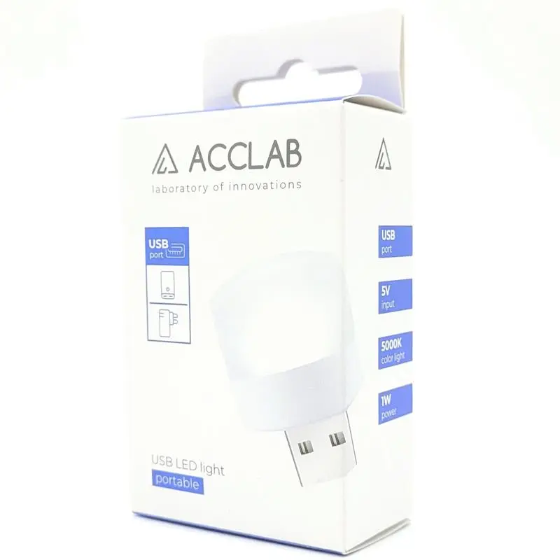 Світлодіодна лампа ACCLAB AL-LED01 (1W, 5000K) – мініатюрний USB-світильник, що випромінює м’яке рівномірне світло, яке підходить для нічного сну та портативного освітлення. Буде корисна у висвітленні намету чи невеликого простору від повербанку. Особливості світлодіодної лампи ACCLAB AL-LED01 (1W, 5000K): Можна підключити до ноутбука, зарядного пристрою, повербанку; Має мініатюрний розмір, зручний для подорожей; Має мале енергоспоживання.