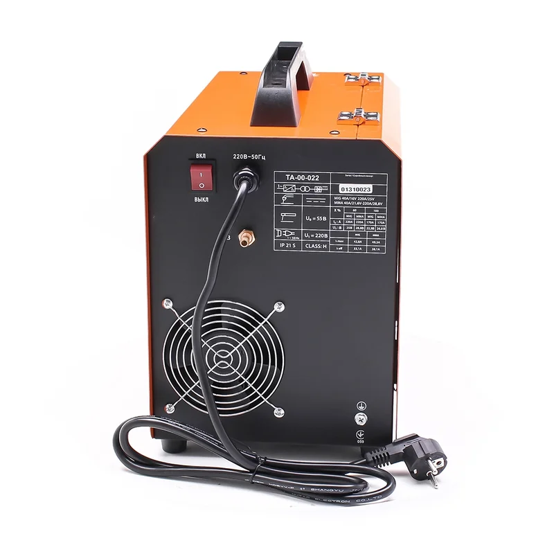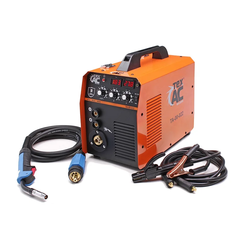 Полуавтоматический сварочный аппарат Тех.АС ТА-00-022 работает в двух режимах MIG/MAG/FLUX и MMA. На лицевой стороне инвертора расположены три регулятора, которые отвечают за регулировку силы тока, напряжения и индуктивности. Диапазон сварочного тока в режиме MIG/MAG/FLUX составляет от 40 до 220, а в режиме MMA от 20 до 170А.
