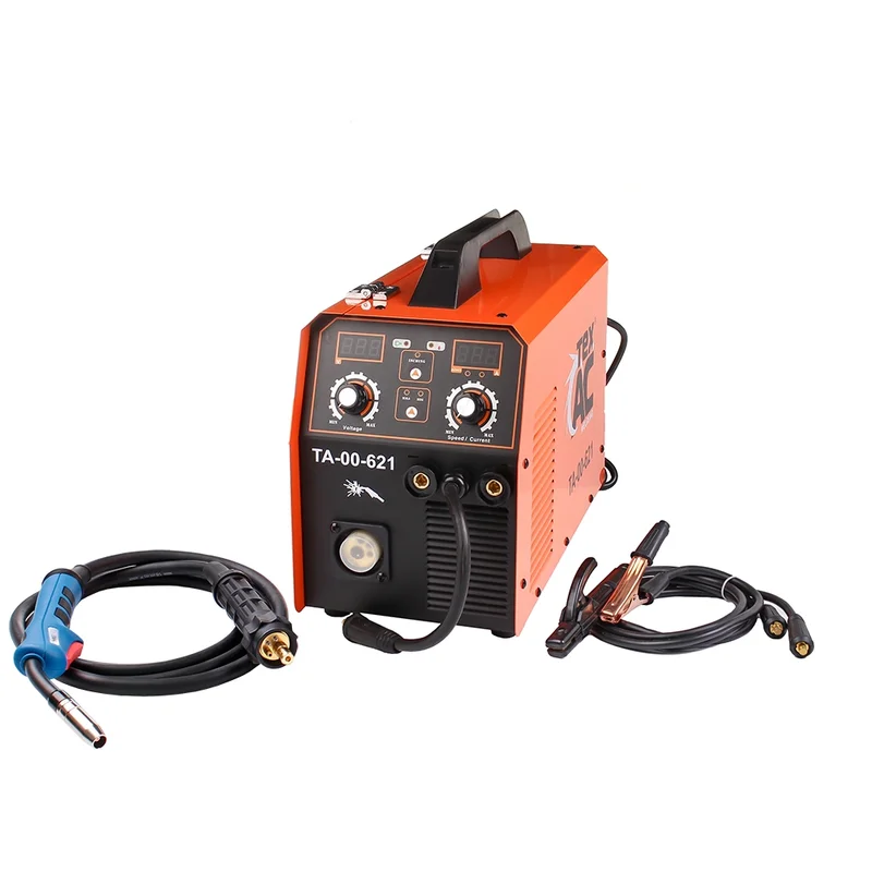 Полуавтоматический сварочный аппарат Тех.АС ТА-00-621 предназначен для сварочных работ в двух режимах MIG/MAG/FLUX и MMA. Для подключения рукава MIG/MAG установлен евро разъем. Диапазон сварочного тока в режиме ММА и MIG/MAG регулируется от 30 до 260А. Для сварочных работ применяются электроды от 1,6 до 4,0мм в режиме ММА, а в режиме MIG/MAG используется сварочная проволока диаметром 0,6-1,0мм.