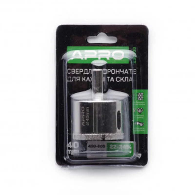 Код: 054272; Довжина: 115; Ширина: 75; Висота: 45; Упаковка: 128; Вага: 0.08984; Розмір: 40 мм; Напрямок обертання: 5; Діаметр стрижня: 40 мм; Найменування для ІМ Укр: Свердло трубчасте з алмазним напиленням 40мм APRO; Посилання на сертіфікат: https://drive.google.com/file/d/14l1srR-fdPeX0Ri-5lKTm1jvDWI9M6vY/view;