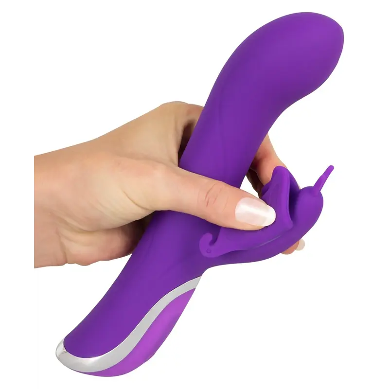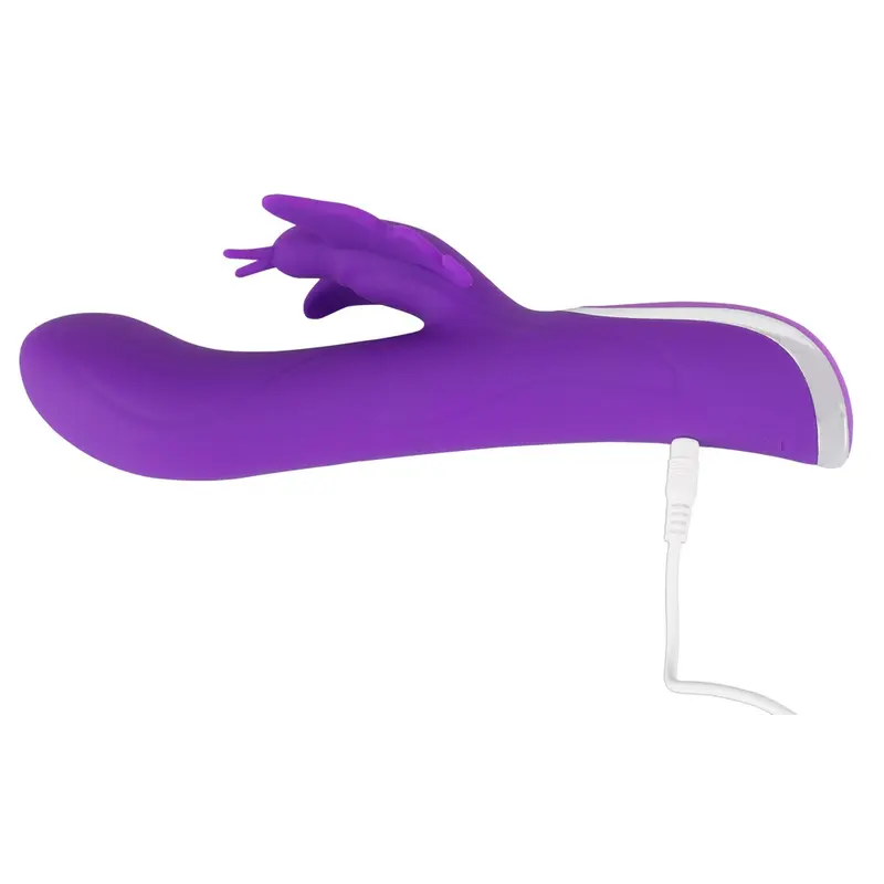 Акумуляторний вібратор кролик зі злегка вигнутим стовбуром і стимулятором клітора у формі метелика. Іграшка яскраво-фіолетового кольору із високоякісного шовковистого силікону, безпечного для здоров'я. 10 режимів вібрації в стимуляторі клітора та 3 швидкості обертання на кінчику вагінального стимулятора. Режими та швидкості можна регулювати окремо.