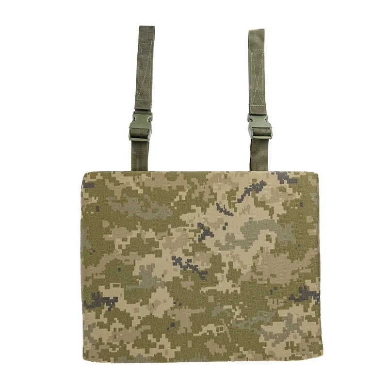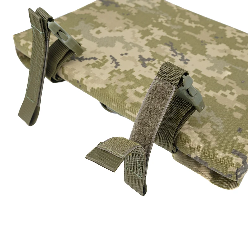 Знімний чохол з Cordura 1000 Den на широкій липучці захищає килимок від пошкоджень. Трикутні панелі з обох боків забезпечують зручну фіксацію на стегнах. Ремінь регульований. Кріпиться на пояс застібками Fastex, що дозволяє за необхідності швидко зняти килимок.