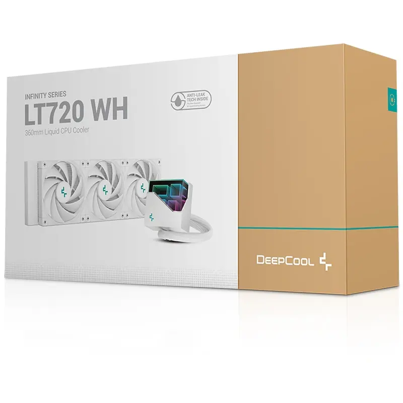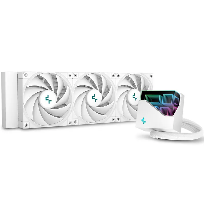 Високопродуктивний рідинний процесорний кулер DeepCool LT720 WH забезпечує потужне розсіювання тепла завдяки 360-міліметровому радіатору, трьом точно налаштованим вентиляторам FK120 і багатовимірній нескінченній дзеркальній верхній кришкі, представленій у чистому повністю білому дизайні.