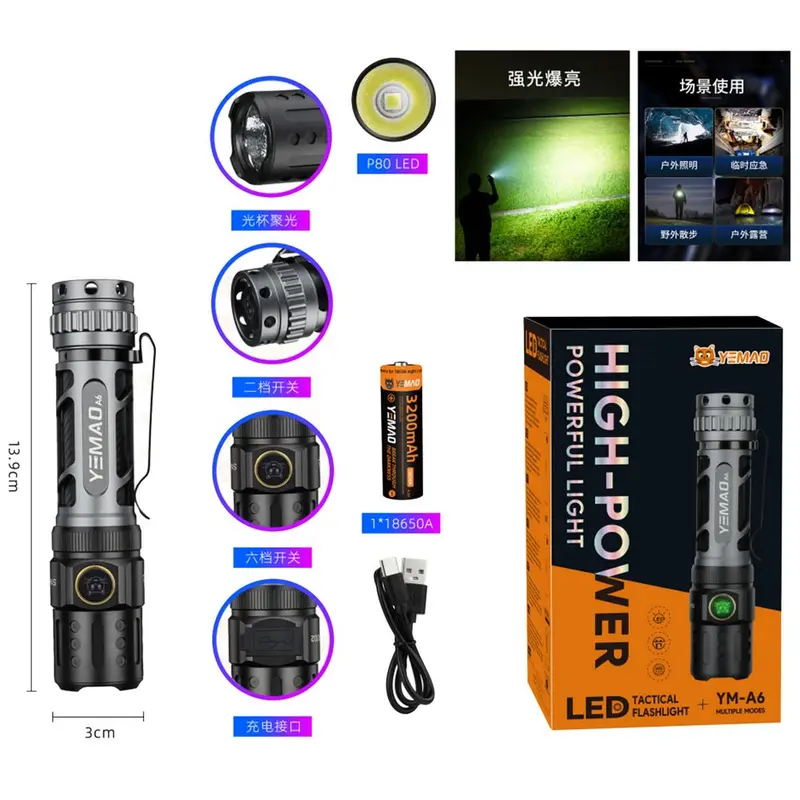 Професійний ліхтар YEMAO YM-А6 — це професійне рішення для тих, хто цінує яскраве світло, міцну конструкцію та максимальну зручність у будь-яких умовах.