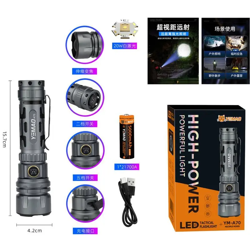 Тактичний ліхтар YEMAO YM-А70, 1500LM, акумулятор 21700 (5000 mAh)
