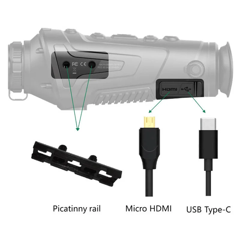 По обе стороны корпуса имеются разъемы для установки переходника на планки Вивер/Пикатинни. Это значительно расширяет возможности по применению тепловизора. Монокуляр можно крепить на оружие и использовать для обнаружения целей. Наилучшего эффекта можно добиться, если подключить к устройству компактный внешний монитор. Для этого можно использовать один из имеющихся интерфейсов: Micro HDMI или USB Type-C.
