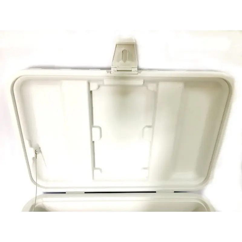 Кришка знімна, фіксується петлями ручки, може перевертатися і використовуватися як міні-столик з двома поглибленнями для банок, склянок і т. п.