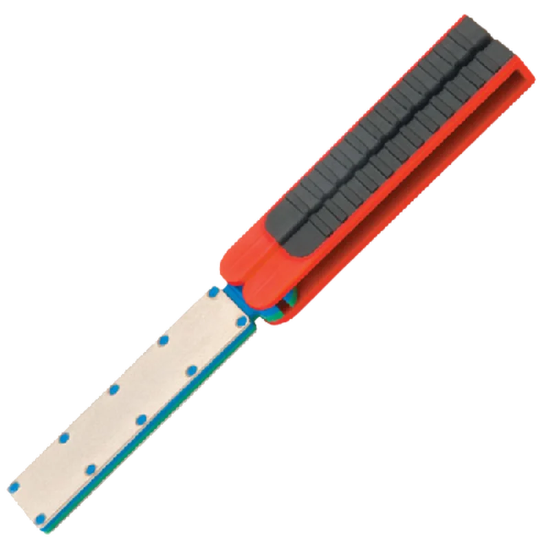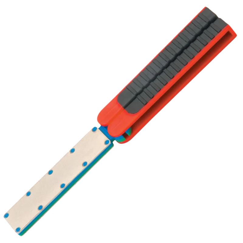 Складна стругачка для ножів Lansky Double-Sided Folding Diamond Sharpening Paddle LNLDFPMF має просту і практичну конструкцію. Рукоятка цієї точила складається з двох частин, і коли точилкою не користуються за призначенням, ці половинки складаються і утворюють футляр для точильного каменя. Таке перевірене часом технічне рішення дозволяє забезпечити компактність в складеному стані довжина точила трохи менше, ніж 9 сантиметрів.