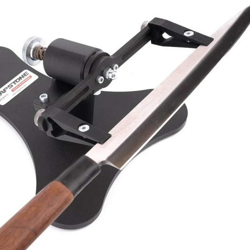 Також від попередніх моделей точильних верстатів Hapstone версії R2 дісталися паркувальна стійка і відмінний універсальний тримач заточувальних брусків. Тримач дозволяє затиснути будь-який розмір каменю від 0 до 160мм довжиною. Він має вузьку направляючу, яка не закриває огляду (місце контакту каменю з підведенням клинка), що дозволяє використовувати будь-які бруски, як вузькі, так і широкі, формату Edge Pro і KME. Для поліпшення комфорту роботи, підтискна пружина тримача каменів захована всередині направляючої. Частина деталей має анодоване покриття, частина пофарбована порошковою фарбою. Так само традиційним для точилок Hapstone можна назвати масивність верстата (всі основні частини зроблені з металу), що разом з тактильним гумовим покриттям опорних площин, надає йому відмінну стійкість на настановної поверхні без додаткових кріплень. Ну і звичайно ж вже звична для виробів Hapstone-швидка і проста збірка.