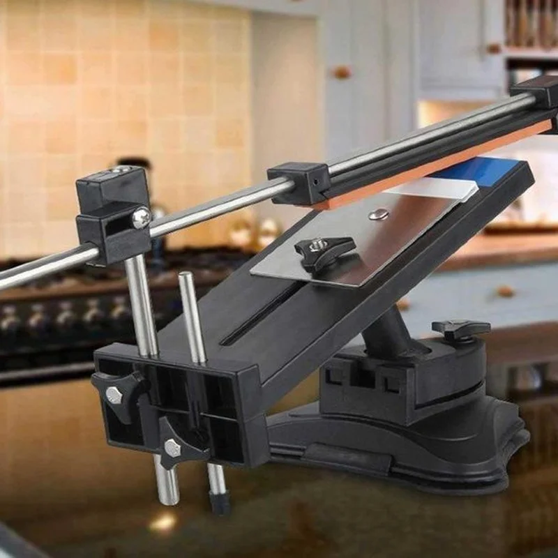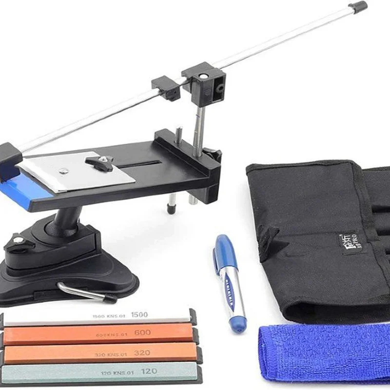 Удосконалена точильная система 30082 дозволяє реалізувати по-справжньому якісну заточку, з якою ваш ніж буде дійсно гострим. Природно, при цьому є можливість вибору кута заточування. Робота з ножами на точильному пристрої 30082 дозволяє добиватися добрих результатів навіть недосвідченим точильщикам, займаються впорядкуванням своїх ножів щоденного використання. У комплекті з точилом йде ряд брусків на пластиковій основі. Таке розмаїття брусків диктується типом зернистості, всього чотири – на 120, 320, 600 і 1500 одиниць. Всі вони, а також синій маркер, зберігаються в чохлі-органайзері з кордури. Крім того, в наборі є і м'яка серветка. Інструкція з докладними схемами допомагає розібратися в пристрої і складання пристосування. З допомогою шарнірного з'єднання станина кріпиться до конструкції, розміщеної на підставці з присоском. Присоска фіксує точило на стільниці або будь-якої плоскої поверхні. При цьому вона повинна бути не фактурної, а гладкою, інакше присоска не буде триматися. Кращий варіант – керамічна плитка.