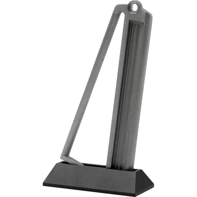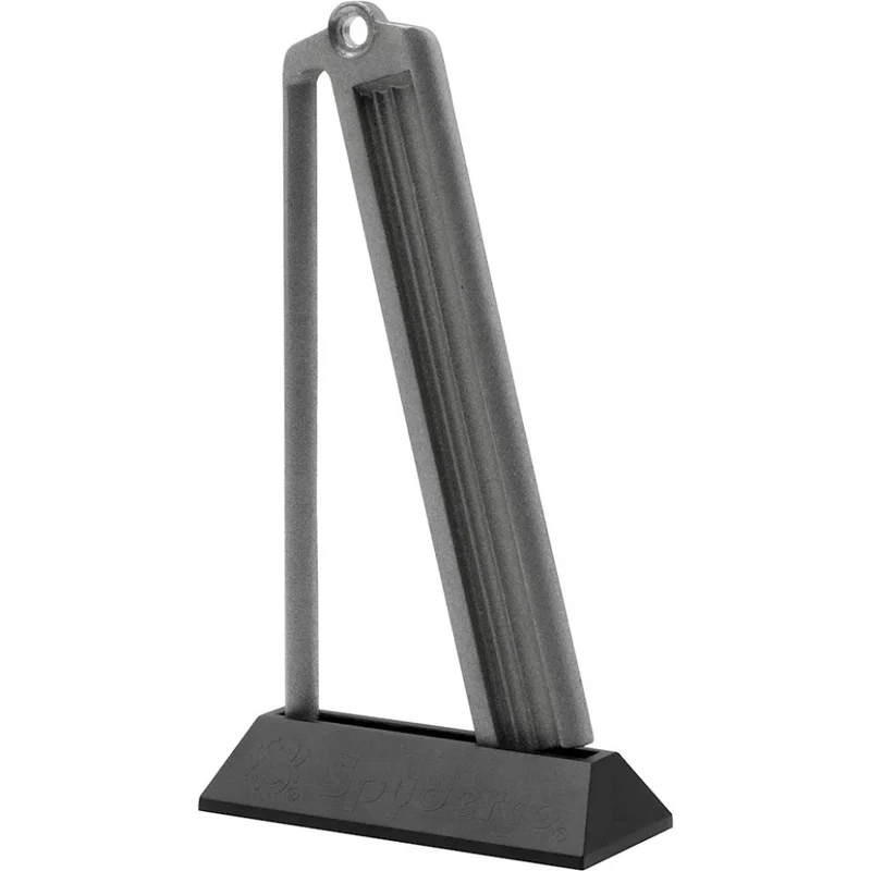 Spyderco Webfoot Stone – це точильний камінь, який виготовлений з цільного шматка вуглецевої сталі та покритий кубічним нітридом бору (CBN) - сучасним абразивним матеріалом, що за твердістю поступається лише алмазу. Завдяки Webfoot Stone можна правити та заточувати ножі, ножиці або інші різальні інструменти під різними кутами. Тримаючи точило за верх та поставивши його більшою стороною вертикально до рівної поверхні, можна заточити різальну крайку ножа у 40 градусів. Якщо поставити точильний камінь у підставку з ABS пластику, яка йде у комплекті, то цей кут зменшується до 30 градусів. Щоб заточити ножиці Spyderco Webfoot Stone потрібно покласти на бік і камінь забезпечить кут заточки у 12,5 градусів.