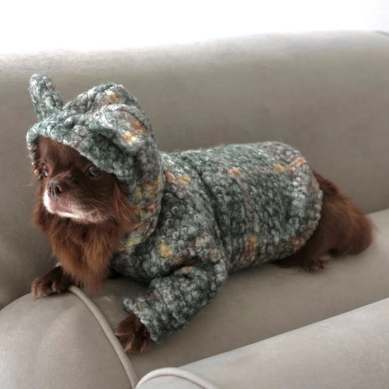букле-шерсть баранчик (60% вовна, 40% поліестер) всередині м'яка, флісова застібається блискавкою на животі є отвір для повідця на шиї капюшон з вушками модель унісекс