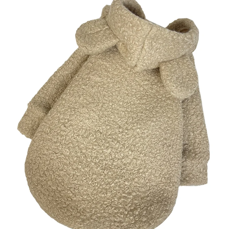 букле-шерсть баранчик (60% вовна, 40% поліестер) всередині м'яка, флісова застібається блискавкою на животі є отвір для повідця на шиї капюшон з вушками модель унісекс