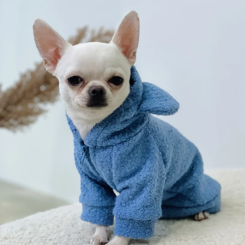 букле-шерсть баранчик (60% вовна, 40% поліестер) всередині м'яка, флісова застібається блискавкою на животі є отвір для повідця на шиї капюшон з вушками модель унісекс