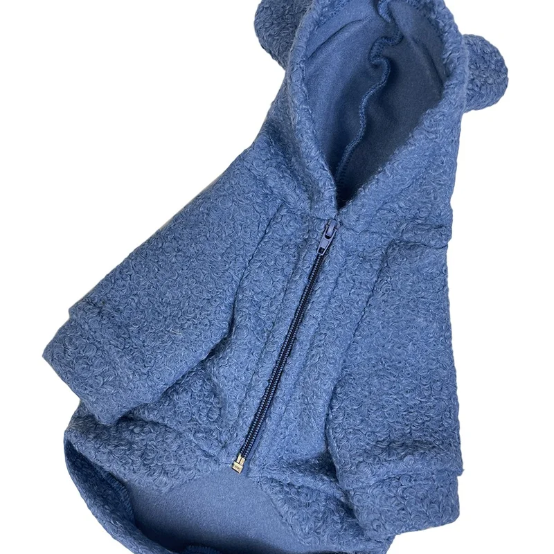 букле-шерсть баранчик (60% вовна, 40% поліестер) всередині м'яка, флісова застібається блискавкою на животі є отвір для повідця на шиї капюшон з вушками модель унісекс