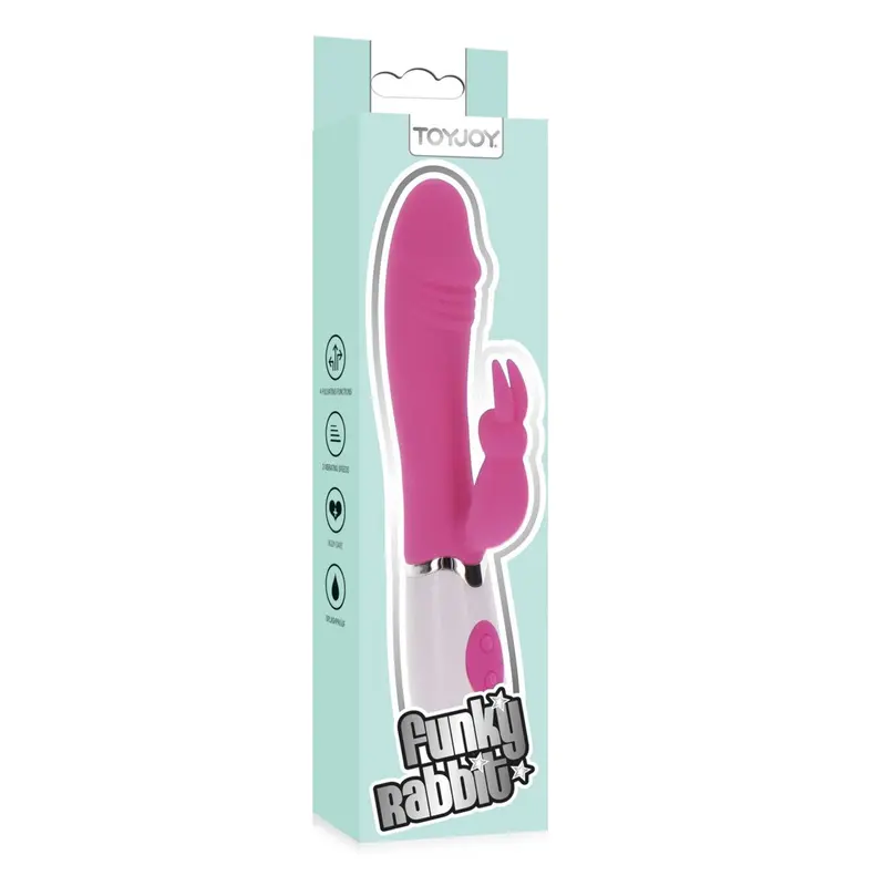 Funky Rabbit - веселый и мощный вибратор в ярком цвете. В игрушке есть стимулятор клитора в виде кролика. Вибратор безопасен для тела, защищен от брызг и изготовлен из 100% чистого силикона.
