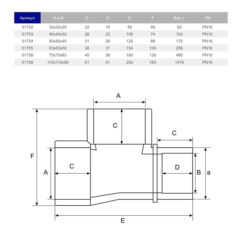 Трійник 90° ПВХ Hidroten 1001755, перехідний В-В-Н, d63x63x50 мм
