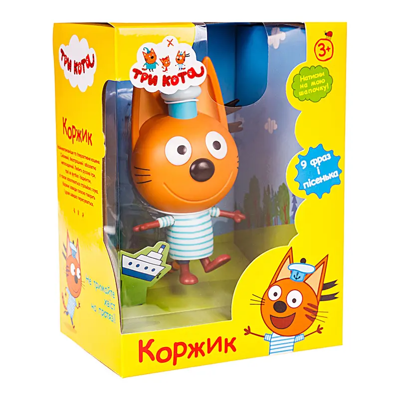 Веселі іграшки котиків із мультфільму «Три коти» сподобаються всім діткам, які люблять тварин. Три коти - улюблений мультфільм про трьох веселих і добрих кошенят: Коржика, Компота та їх молодшу сестричку - Карамельку. Коржик - найбільш невгамовне і гіперактивне кошеня. Сміливий, безстрашний та абсолютно непосидючий. Любить рухливі ігри, такі як футбол та бадмінтон, а також захоплюється стріляниною з лука. Корж завжди голосно говорить і дуже швидко пересувається.У фігурки рухливі ручки, ніжки та голова. Якщо натиснути на шапочку, то зазвучить пісенька, а ще Коржик може вимовляти 9 різних фраз. Іграшка працює від 3-х батарейок типу AG 13 1,5 В, які входять до комплекту. Іграшка призначена для дітей від 3-х років Висота фігурки - 15,7 см.