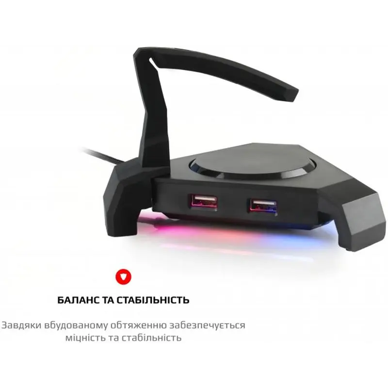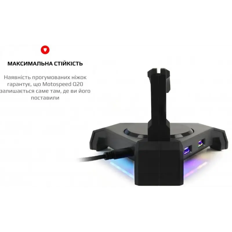 Motospeed Q20 виконує важливу функцію з підтримки чистоти й організованості ігрової зони. Поєднавши в собі сучасний дизайн із яскравим привабливим освітленням RGB і зручним 4-портовим USB-хабом, Motospeed Q20 стає вельми корисним доповненням до ігрового столу. Надійний, гнучкий, функціональний і сумісний із будь-якою дротовою мишкою — з цими якостями він сподобається всім. Підсвітка RGB На Motospeed Q20 встановлені чотири режими підсвічування, які можна змінювати простим натисненням кнопки. Надзручний USB-хаб 4-портовий USB-хаб — ідеальний варіант для заряджання або синхронізації пристроїв, приєднання допоміжної периферії або зберігання даних на портативних USB-носіях. Баланс і стабільність Завдяки вбудованому обтяженню, забезпечується міцність і стабільність. Вага спеціально збалансована так, щоб забезпечити низький центр тяжіння Q20. Це робить практично неможливим перевертання його під час гри. Ідеальна гнучкість Гнучка рука Motospeed Q20 рухається синхронно з рухами мишки, забезпечуючи вам найкращий контроль над мишкою. Максимальна стійкість Наявність прогумованих ніжок гарантує, що Motospeed Q20 залишається саме там, де ви його поставили. Його форм-фактор забезпечує безпрецедентну стабільність, а також унеможливлює зачеплення кабелю.
