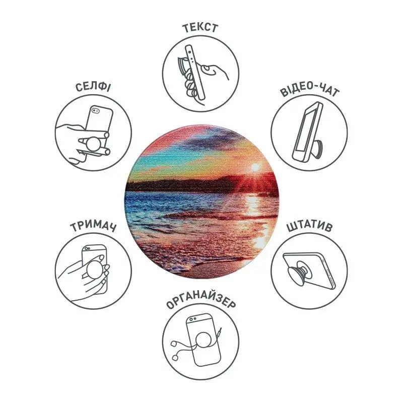 Забезпечує надійне зчеплення, щоб ви могли надсилати текстові повідомлення однією рукою, знімати кращі фотографії та переглядати відео. Функціонує як зручна підставка, завдяки якій ви можете переглядати відео. Використовуйте, як штатив для найкращих селфі або відео-конференції. Надійна липучка 3М приклеюється до більшості пристроїв та чохлів. Розміри: діаметр 39,74 мм х 7 мм і 24,25 мм в розкладеному вигляді.