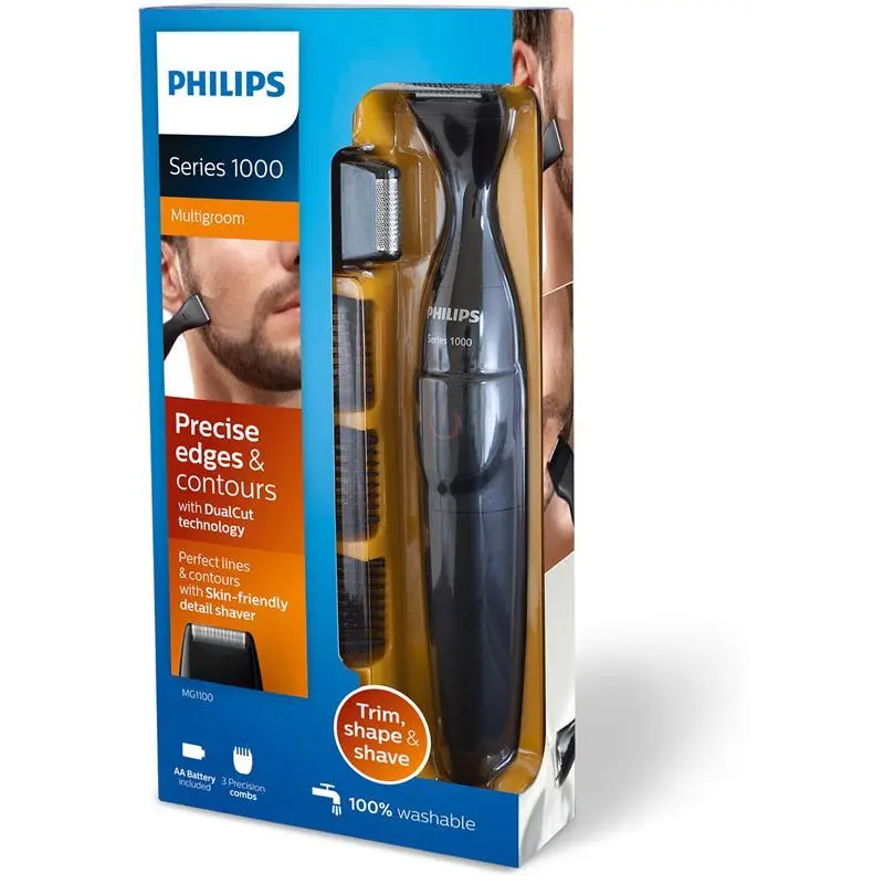 Трімер PHILIPS MG1100/16 являє собою міні бритву, створену спеціально для догляду за бородою, вусами, щетиною і для гоління невеликих областей обличчя. Має ергономічний дизайн. Найефективніший спосіб домогтися ефекту 3-х денної щетини - це використовувати даний тример при гоління. Технологія DualCut забезпечує більш точну і безпечну стрижку, допомагаючи уникнути подразнення шкіри, завдяки ріжучому блоку з подвійною заточкою і надзвичайно низьким тертям. Не вимагає мастила. Триммер даної моделі допоможе вам створити неповторний образ, бути стильним, модним, сучасним і впевненим у собі. PHILIPS MG1100/16 забезпечує високу точність підрівнювання від 0,5 мм - 10 мм. Потрібну довжину легко вибрати і встановити. Високу якість стрижки забезпечують леза з титановим покриттям, а їх заокруглені краї легко ковзають по шкірі, не травмуючи її. Комплектується прилад трьома насадками-гребенями різної довжини: 1, 3 і 5 мм, а також щіточкою для чищення лез. Може бути використаний під водою і в душі. Ширина бритвеної головки - 21 мм. Вага - 0,13 кг. Живлення - батареї АА.