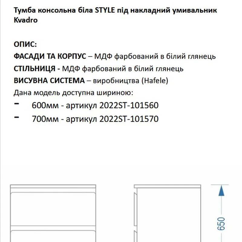 Тумба консольна біла STYLE 60cм під накладний умивальник Kvadro 50см (2022ST-101560)