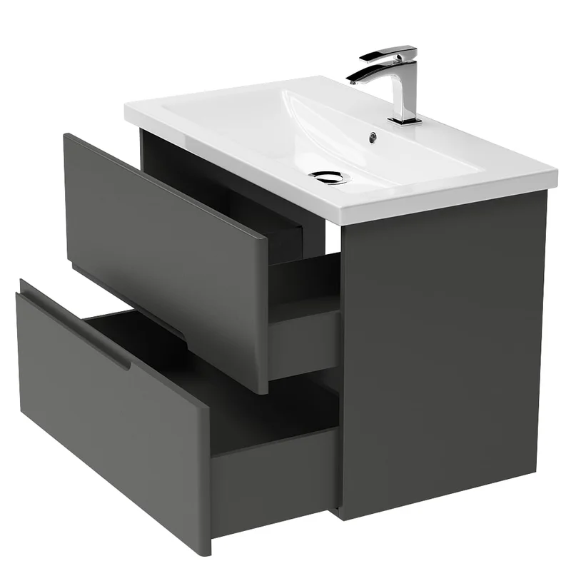 Колекція GRACE - консольна тумба з шухлядами плавного типу закривання. Умивальник - штучний камінь. Доступна в розмірах: 60 / 70 / 80 см.КОРПУС – ламіноване ДСП 16мм ФАСАД - МДФ двостороннього ламінування 19мм, фарбовані матовою фарбою, колір - графітШУХЛЯДИ - ламіноване ДСП 16мм ВИСУВНА СИСТЕМА – направляюча з дотягом (Hafele) УМИВАЛЬНИК – штучний камінь