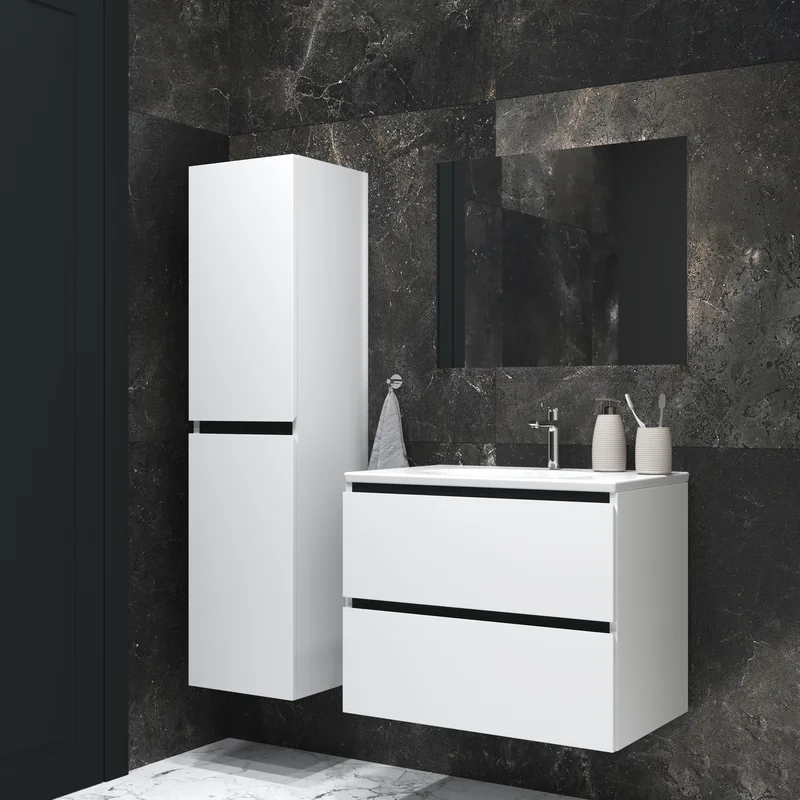 Колекція ORION – біла тумба консольна на дві шухляди з чорними вставками. Умивальник - литий мармур. Можлива ширина тумби: 70 / 80 / 90 см.
