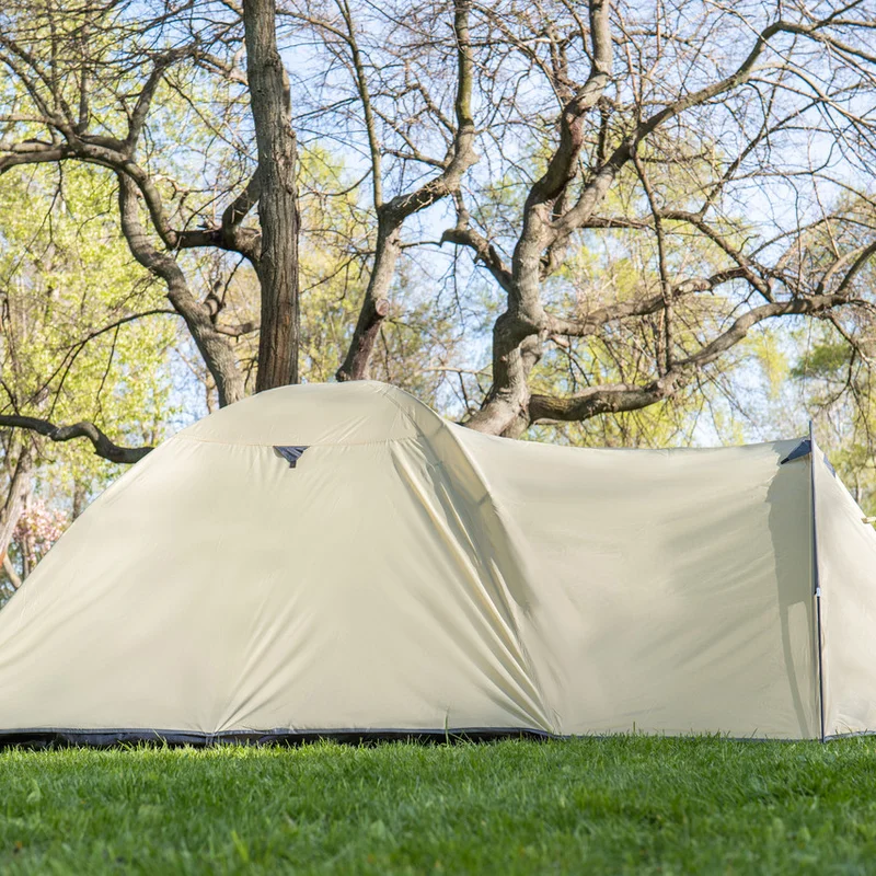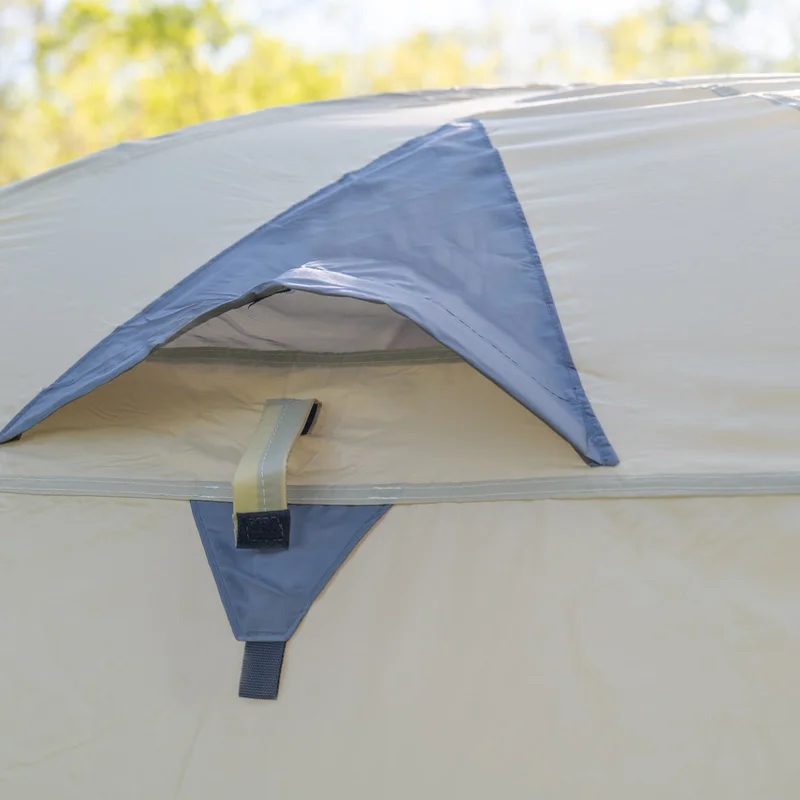 - зовнішній матеріал, який натягується та кріпиться поверх кімнати, утворюючи додатково тамбур намету. Зовнішній шар посилений PU покриттям, що забезпечує захист виробу від УФ-випромінювання та водостійкість до 2000 мм водяного стовпа. Для забезпечення комфортної циркуляції повітря передбачене вентиляційне віконце, а вхід-вихід між тамбуром і кімнатою продубльований антимоскітною сіткою.