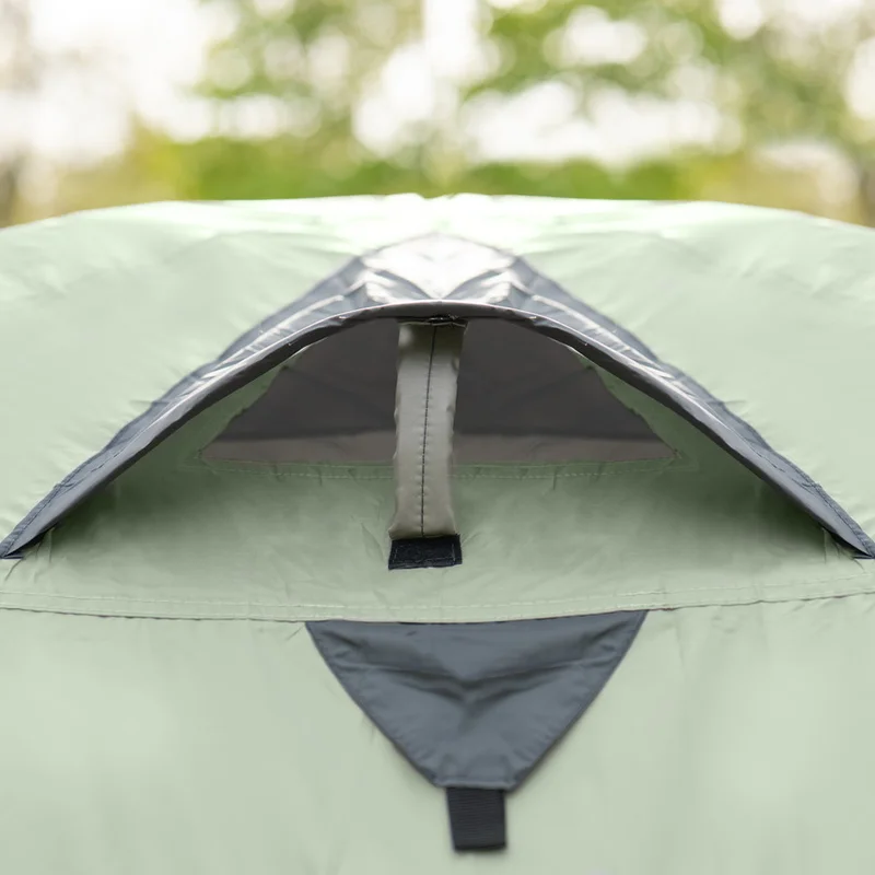 - зовнішній матеріал, який натягується та кріпиться поверх кімнати, утворюючи додатково тамбур намету. Зовнішній шар посилений PU покриттям, що забезпечує захист виробу від УФ-випромінювання та водостійкість до 2000 мм водяного стовпа. Для забезпечення комфортної циркуляції повітря передбачене вентиляційне віконце, а вхід-вихід між тамбуром і кімнатою продубльований антимоскітною сіткою.