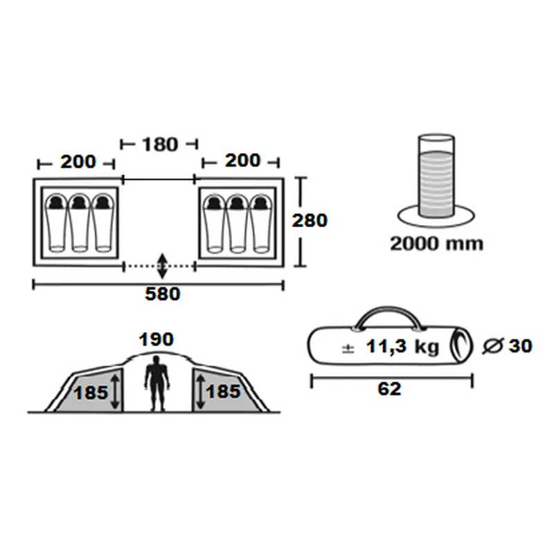 Намет являє собою два спальних місця (кімнати) на 6 осіб (по 3) та місткий тамбур між ними.