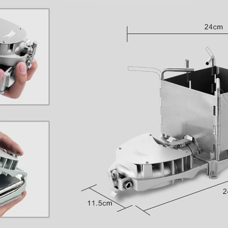 Нагрівач компактний та легкий. Його розміри становлять: довжина – 24 сантиметри, висота – 12 сантиметрів. Виготовлена піч-трісочниця з міцної сталі, вона стійка до дії жару, і захищена від іржі. У складеному вигляді пальник вміститься на долоні. Опорні стрижні повертаються відповідно до розміру котла. Конструкція витримує навантаження до двадцяти чотирьох кілограмів.