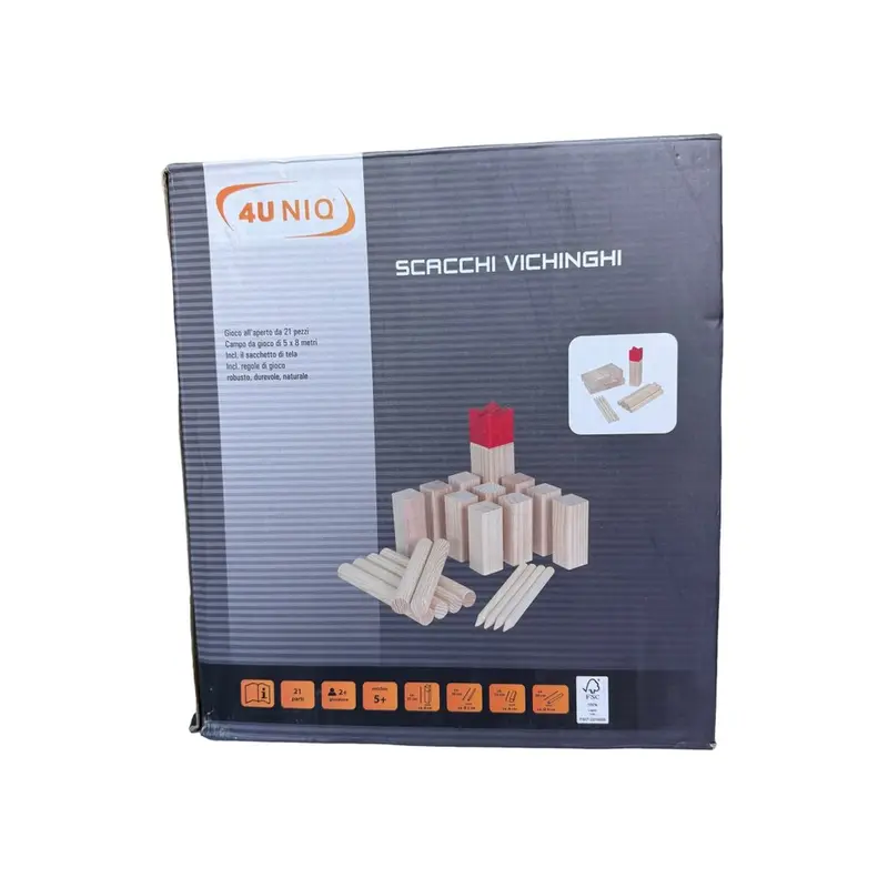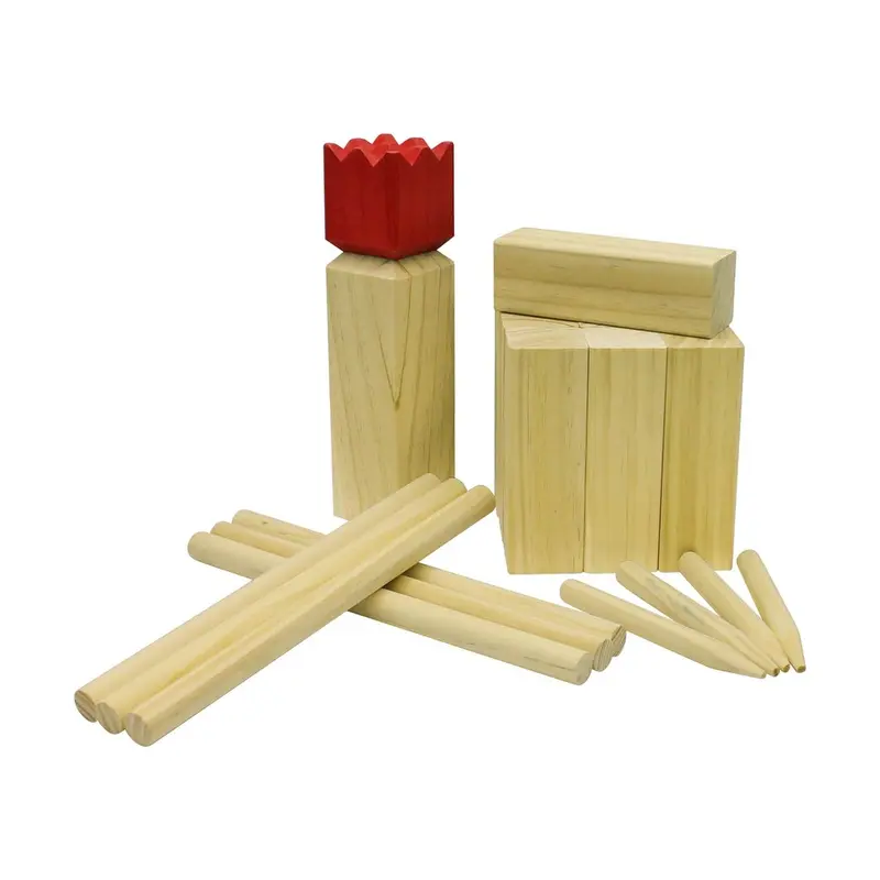 ХАРАКТЕРИСТИКИ И СОДЕРЖАНИЕ: 1 король (размеры: (7,2 х 7,2 = 30). 10 пешек (размеры: (4,8 х 4,8 = 30). 6 палок для метания (размеры: 3 х 28 см)).4 полосы ограничения (размер: 1,9х).