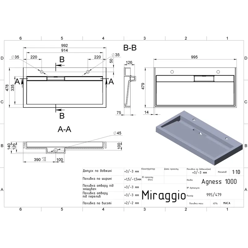 Умивальник AGNESS 1000 MATT MIRAGGIO зі штучного каменю - це практичне рішення для санвузла дому, готелю чи дачі.