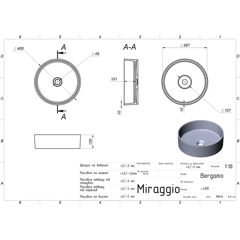 Умивальник BERGAMO MATT MIRAGGIO зі штучного каменю - це практичне рішення для санвузла дому, готелю чи дачі.