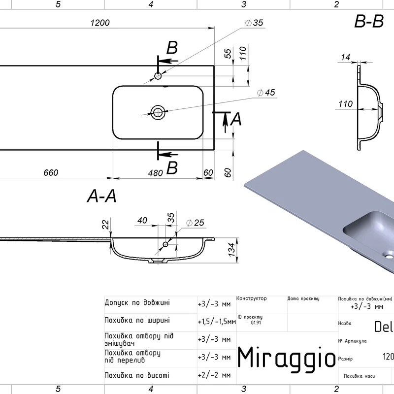 Умивальник DELLA 1200 R MIRASOFT Miraggio