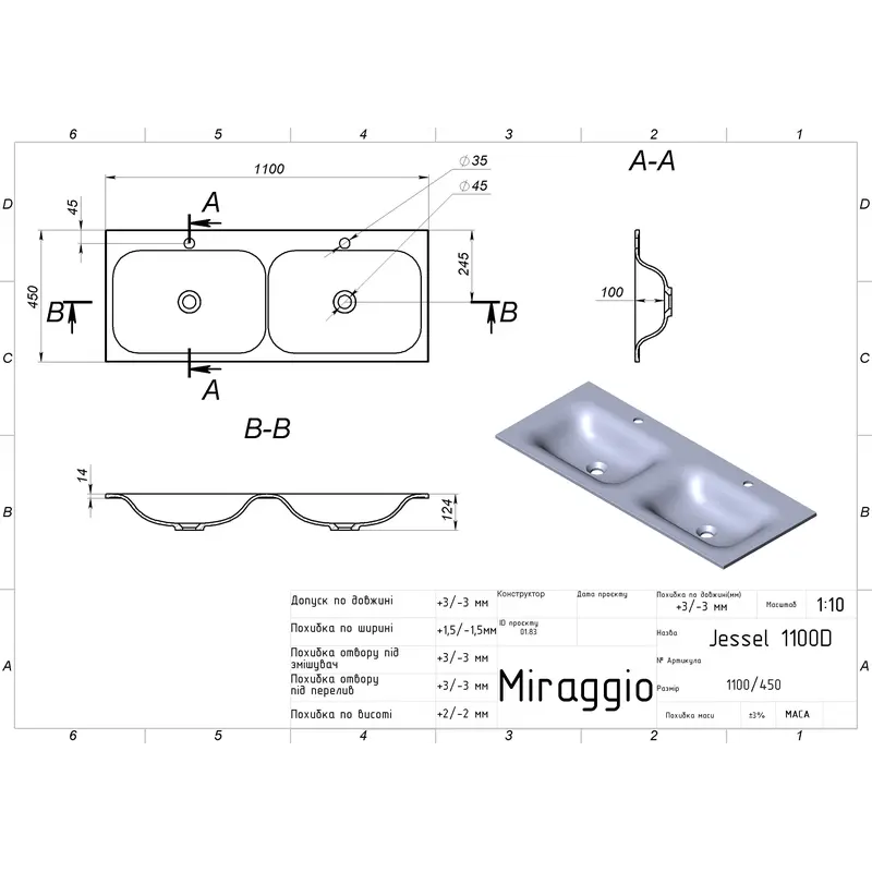 Умивальник JESSEL 1100-2 MIRAGGIO зі штучного каменю - це практичне рішення для санвузла дому, готелю чи дачі.