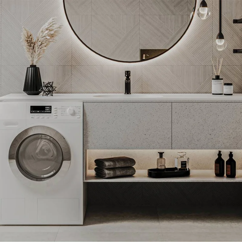 Деякі моделі умивальників можуть бути виготовлені з кварцового піску - в чорному або сірому кольорі. Такі вироби ідеально пасуватимуть ванній кімнаті в стилі лофт.