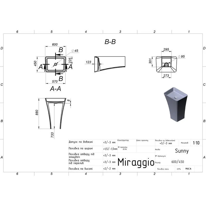Умивальник SUNNY MIRASOFT MIRAGGIO зі штучного каменю - це практичне рішення для санвузла дому, готелю чи дачі.