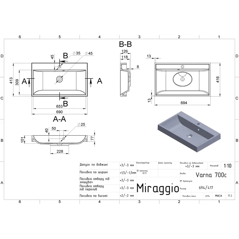 Умивальник VARNA 700 MIRASOFT Miraggio